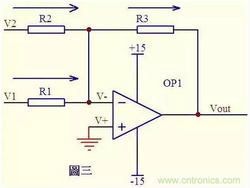 圖三中,由虛短知: V- = V+ = 0 ……a 由虛斷及基爾霍夫定律知,通過R2與R1的電流之和等于通過R3的電流, 故 (V1 – V-)/R1 + (V2 – V-)/R2 = (Vout – V-)/R3 ……b 代入a式,b式變?yōu)閂1/R1 + V2/R2 = Vout/R3 如果取R1=R2=R3,則上式變?yōu)閂out=V1+V2,這就是傳說中的加法器了。