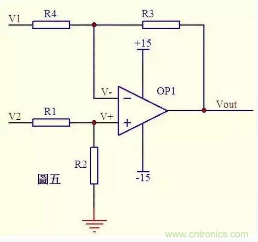 請看圖四。因為虛斷,運放同向端沒有電流流過,則流過R1和R2的電流相等,同理流過R4和R3的電流也相等。故 (V1 – V+)/R1 = (V+ - V2)/R2 ……a (Vout – V-)/R3 = V-/R4 ……b 由虛短知: V+ = V- ……c 如果R1=R2,R3=R4,則由以上式子可以推導出 V+ = (V1 + V2)/2 V- = Vout/2 故 Vout = V1 + V2 也是一個加法器。