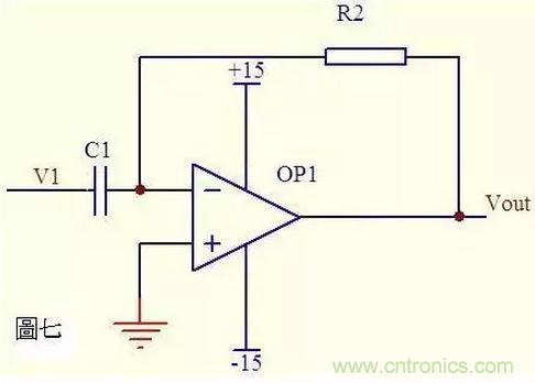圖七中由虛斷知,通過電容C1和電阻R2的電流是相等的,由虛短知,運放同向端與反向端電壓是相等的。則: Vout = -i * R2 = -(R2*C1)dV1/dt 這是一個微分電路。如果V1是一個突然加入的直流電壓,則輸出Vout對應一個方向與V1相反的脈沖。