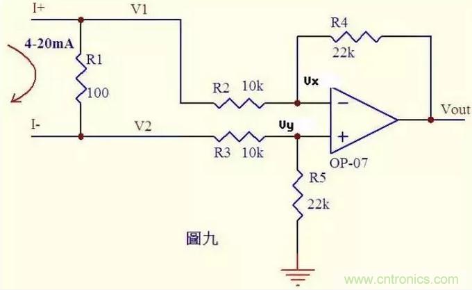 分析一個大家接觸得較多的電路。很多控制器接受來自各種檢測儀表的0~20mA或4~20mA電流,電路將此電流轉換成電壓后再送ADC轉換成數(shù)字信號,圖九就是這樣一個典型電路。如圖4~20mA電流流過采樣100Ω電阻R1,在R1上會產(chǎn)生0.4~2V的電壓差。由虛斷知,運放輸入端沒有電流流過,則流過R3和R5的電流相等,流過R2和R4的電流相等。 故: (V2-Vy)/R3 = Vy/R5 ……a (V1-Vx)/R2 = (Vx-Vout)/R4 ……b 由虛短知: Vx = Vy ……c 電流從0~20mA變化,則V1 = V2 + (0.4~2) ……d 由cd式代入b式得(V2 + (0.4~2)-Vy)/R2 = (Vy-Vout)/R4 ……e 如果R3=R2,R4=R5,則由e-a得Vout = -(0.4~2)R4/R2 ……f 圖九中R4/R2=22k/10k=2.2,則f式Vout = -(0.88~4.4)V,即是說,將4~20mA電流轉換成了-0.88 ~ -4.4V電壓,此電壓可以送ADC去處理。