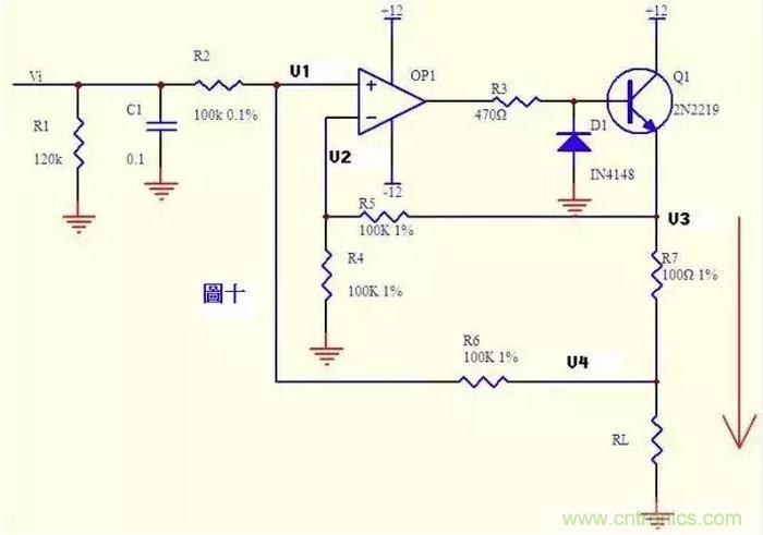 電流可以轉換成電壓,電壓也可以轉換成電流。圖十就是這樣一個電路。上圖的負反饋沒有通過電阻直接反饋,而是串聯(lián)了三極管Q1的發(fā)射結,大家可不要以為是一個比較器就是了。只要是放大電路,虛短虛斷的規(guī)律仍然是符合的!