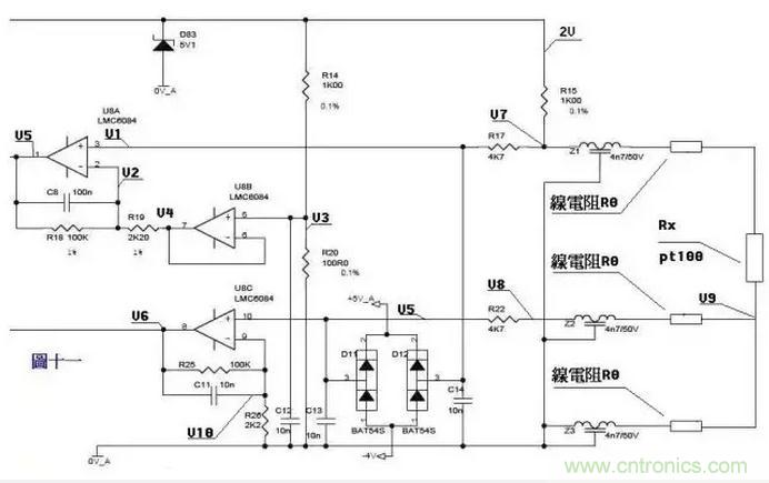 來一個復雜的,圖十一是一個三線制PT100前置放大電路。PT100傳感器引出三根材質、線徑、長度完全相同的線,接法如圖所示。有2V的電壓加在由R14、R20、R15、Z1、PT100及其線電阻組成的橋電路上。Z1、Z2、Z3、D11、D12、D83及各電容在電路中起濾波和保護作用,靜態(tài)分析時可不予理會,Z1、Z2、Z3可視為短路,D11、D12、D83及各電容可視為開路。 由電阻分壓知, V3=2*R20/(R14+20)=200/1100=2/11 ……a 由虛短知,U8B第6、7腳 電壓和第5腳電壓相等 V4=V3 ……b 由虛斷知,U8A第2腳沒有電流流過,則流過R18和R19上的電流相等。 (V2-V4)/R19=(V5-V2)/R18 ……c 由虛斷知,U8A第3腳沒有電流流過, V1=V7 ……d 在橋電路中R15和Z1、PT100及線電阻串聯(lián),PT100與線電阻串聯(lián)分得的電壓通過電阻R17加至U8A的第3腳, V7=2*(Rx+2R0)/(R15+Rx+2R0) …..e 由虛短知,U8A第3腳和第2腳電壓相等, V1=V2 ……f 由abcdef得, (V5-V7)/100=(V7-V3)/2.2 化簡得 V5=(102.2*V7-100V3)/2.2 即 V5=204.4(Rx+2R0)/(1000+Rx+2R0) – 200/11 ……g 上式輸出電壓V5是Rx的函數(shù) 我們再看線電阻的影響。Pt100最下端線電阻上產(chǎn)生的電壓降經(jīng)過中間的線電阻、Z2、R22,加至U8C的第10腳,由虛斷知, V5=V8=V9=2*R0/(R15+Rx+2R0) ……a (V6-V10)/R25=V10/R26 ……b 由虛短知, V10=V5 ……c 由式abc得 V6=(102.2/2.2)V5=204.4R0/[2.2(1000+Rx+2R0)] ……h 由式gh組成的方程組知,如果測出V5、V6的值,就可算出Rx及R0,知道Rx,查pt100分度表就知道溫度的大小了。