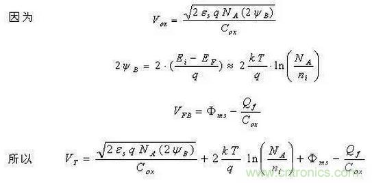 【答】E-MOSFET的閾值電壓就是使半導(dǎo)體表面產(chǎn)生反型層(導(dǎo)電溝道)所需要加的柵極電壓。對于n溝道E-MOSFET,當柵電壓使得p型半導(dǎo)體表面能帶向下彎曲到表面勢ψs≥2ψB時,即可認為半導(dǎo)體表面強反型,因為這時反型層中的少數(shù)載流子(電子)濃度就等于體內(nèi)的多數(shù)載流子濃度(~摻雜濃度);這里的ψB是半導(dǎo)體Fermi勢,即半導(dǎo)體禁帶中央與Fermi能級之差。閾值電壓VT包含有三個部分的電壓(不考慮襯偏電壓時):柵氧化層上的電壓降Vox;半導(dǎo)體表面附近的電壓降2ΨB:抵消MOS系統(tǒng)中各種電荷影響的電壓降——平帶電壓VF。