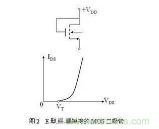 【答】這種集成MOS二極管的連接方式及其伏安特性如圖2所示。因為柵極與漏極短接,則VGS=VDS。因此,當電壓較?。╒GS=VDS<VT)時,不會出現(xiàn)溝道,則器件處于截止狀態(tài),輸出電流IDS=0;當電壓高于閾值電壓(VGS=VDS≥VT)時,因為總滿足VDS>(VGS-VT)關(guān)系,于是出現(xiàn)了溝道、但總是被夾斷的,所以器件處于飽和狀態(tài),輸出源-漏電流最大、并且飽和,為恒流源。