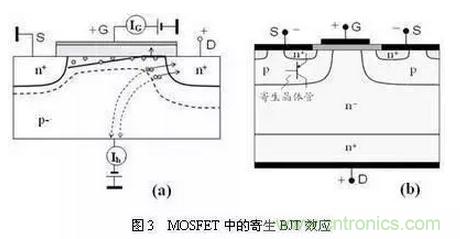 ③對于VDMOSFET:觀察圖3(b)中的結(jié)構(gòu),即可見到,當器件正向?qū)〞r,其中存在一個工作于放大狀態(tài)的寄生n-p-n晶體管(n+源區(qū)是發(fā)射區(qū),n-外延層是集電區(qū),p溝道是基區(qū))。該寄生晶體管的可能導(dǎo)電通道是與MOSFET的ID相并聯(lián)的,故在VDMOSFET工作時,必須要注意防止寄生晶體管導(dǎo)通;否則,寄生晶體管的導(dǎo)通就可能引起二次擊穿,使得功率MOSFET完全失去功能。