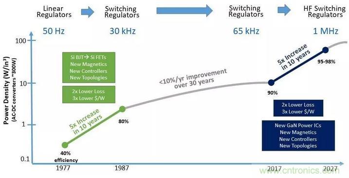 功率密度(AC-DC轉(zhuǎn)換器~300W);線性調(diào)節(jié)器;開關(guān)調(diào)節(jié)器;高頻開關(guān)調(diào)節(jié)器;新磁性元件;新控制器;新拓撲結(jié)構(gòu);2倍低損耗;3倍低成本/W;10年5倍提升;超過30年每年<10%改善;十年5倍提升;新GaN功率IC;效率。