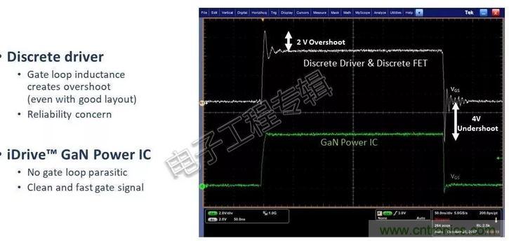 沒有柵極阻抗或電阻的分立解決方案會產(chǎn)生不穩(wěn)定的電路。 如果添加了阻抗,它會變得穩(wěn)定,但也會導致很長的開關(guān)周期。 因此,如果可以直接連接驅(qū)動器輸出和柵極輸入,那么就可以快速運行并保持穩(wěn)定。壓擺率只需要一個電阻即可搞定。 因此,集成意味著一種非常可控的高性能器件。