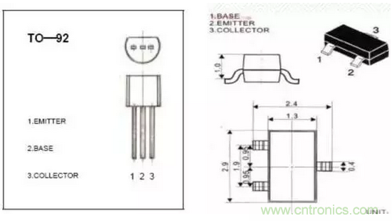 ※三極管引腳極性:插件引腳圖示(1),貼件引腳圖示(2)下圖為9014。般中小功率的三極管都是遵守左向右依次為ebc(條件是中小功率塑料三極管按圖使其平面朝向自己,三個(gè)引腳朝下放置,則從左到右依次為ebc)