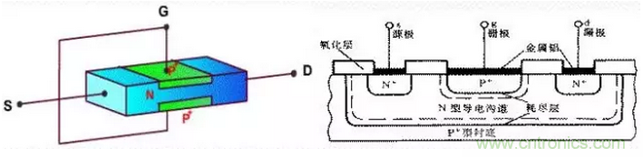 ※場(chǎng)效應(yīng)分類:場(chǎng)效應(yīng)管主要有結(jié)型場(chǎng)效應(yīng)管(JFET)和絕緣柵型場(chǎng)效應(yīng)管(IGFET)。絕緣柵型場(chǎng)效應(yīng)管的襯底(B)與源析(S)連在一起,它的三個(gè)極分別為柵極(G)、漏極(D)和源極(S)。晶體管分NPN和PNP管,它的三個(gè)極分別為基極(b)、集電極(c)、發(fā)射極(e)。場(chǎng)效應(yīng)管的G、D、S極與晶體管的b、c、e極有相似的功能。絕緣柵型效應(yīng)管和結(jié)型場(chǎng)效應(yīng)管的區(qū)別在于它們的導(dǎo)電機(jī)構(gòu)和電流控制原理根本不同,結(jié)型管是利用耗盡區(qū)的寬度變化來(lái)改變導(dǎo)電溝道的寬窄以便控制漏極電流,絕緣柵型場(chǎng)效應(yīng)管則是用半導(dǎo)體表面的電場(chǎng)效應(yīng)、電感應(yīng)電荷的多少去改變導(dǎo)電溝道來(lái)控制電流。它們性質(zhì)的差異使結(jié)型場(chǎng)效應(yīng)管往往運(yùn)用在功放輸入級(jí)(前級(jí)),絕緣柵型場(chǎng)效應(yīng)管則用在功放末級(jí)(輸出級(jí))。場(chǎng)效應(yīng)管的工作原理和三極管其本一樣,只是他們一個(gè)是壓控型元件,一個(gè)是電流控制元件,場(chǎng)效應(yīng)管只有一個(gè)PN結(jié),如圖所示1-1
