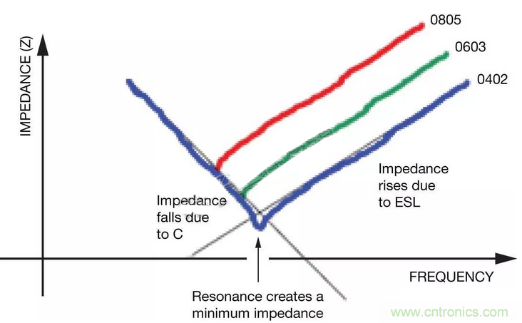 高速電路是一個(gè)例外,其中的感應(yīng)負(fù)載可能會(huì)延遲傳送來自電容的所需電流,從而影響電路性能。阻抗(Z)的影響因外殼尺寸而有不同,如圖4所示。