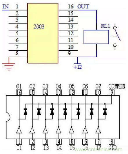 根據(jù)集成電路驅(qū)動器2003的輸入輸出特性,有人把它簡稱叫“驅(qū)動器”“反向器”“放大器”等,現(xiàn)在常用型號為:TD62003AP。當(dāng)2003輸入端為高電平時,對應(yīng)的輸出口輸出低電平,繼電器線圈通電,繼電器觸點吸合;當(dāng)2003輸入端為低電平時,繼電器線圈斷電,繼電器觸點斷開;在2003內(nèi)部已集成起反向續(xù)流作用的二極管,因此可直接用它驅(qū)動繼電器。