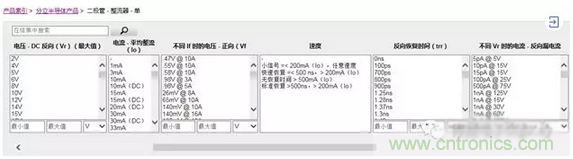 在Digi-Key網(wǎng)站,可以根據(jù)不同二極管類型及設(shè)計(jì)參數(shù)的要求,篩選合適的二極管。