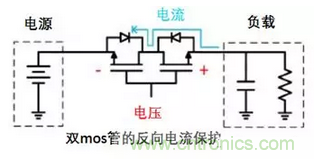 如下所示,利用2個(gè)MOS管背靠背地連接是一個(gè)不錯(cuò)的解決方案。當(dāng)2個(gè)MOS管關(guān)閉,它們可以阻斷兩個(gè)方向電流的流通。與二極管的解決方案相比,MOS管可以支持更低的電源壓降供應(yīng)給負(fù)載。但是,如果要實(shí)現(xiàn)這種方案,需要多個(gè)元器件配合,使得電路會(huì)在電路板上占用更多的空間。