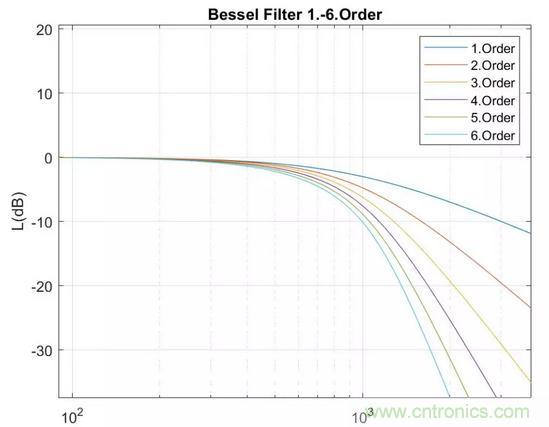 同Butterworth濾波器一樣,其階數(shù)越高,阻帶衰減也就越快,但是從通帶的幅值響應(yīng)看來,其保留通帶部分的能力沒有Butterworth濾波器出色。Bessel濾波器具有最平坦的幅度和相位響應(yīng)。帶通的相位響應(yīng)近乎呈線性。Bessel濾波器可用于減少所有IIR濾波器固有的非線性相位失真。Bessel線性相位濾波器正是由于具有向其截止頻率以下的所有頻率提供等量延時(shí)的特性,才被用于音頻設(shè)備中。在音頻設(shè)備中,必須在不損害頻帶內(nèi)多信號(hào)的相位關(guān)系前提下,消除帶外噪聲。