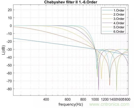 該濾波器根據(jù)俄羅斯數(shù)學(xué)家PafnutyChebyshev來命名的,因?yàn)樵O(shè)計(jì)該濾波器所使用的數(shù)學(xué)模型正是基于切比雪夫多項(xiàng)式。該濾波器的特點(diǎn)是過渡帶衰減快,和理想濾波器之間的誤差最小,但是在通帶(Type I)或者阻帶(Type II)存在幅度波動(dòng)。