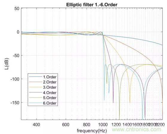 1到6階截止頻率為1000Hz的橢圓低通濾波器幅值特性如下圖