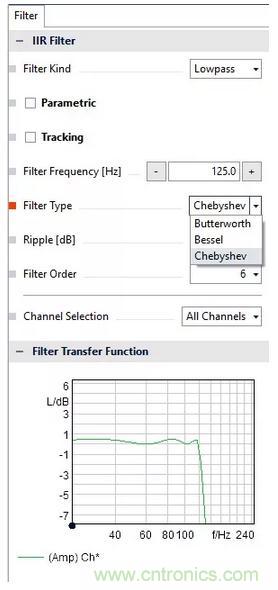 有三種IIR濾波器可供選擇,分別為切比雪夫I型、貝塞爾以及巴特沃斯濾波器。對(duì)于不同類型的濾波器可自定義參數(shù)。比如對(duì)于巴特沃斯濾波器需要定義截止頻率和濾波器階數(shù),如果是帶通或者帶阻,還需要確定通帶/阻帶帶寬;如果是切比雪夫?yàn)V波器的話,還需要確定波動(dòng)值。