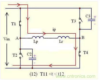 在t11-t12的時(shí)間內(nèi),副邊的二極管D1,D2還是同時(shí)導(dǎo)通流過(guò)電流,將副邊繞組短路,阻斷輸出電感反射到初級(jí)的途徑,此時(shí)的負(fù)載電流還是由次級(jí)電感與輸出電容提供;同時(shí),由于原邊的T1,T4已經(jīng)導(dǎo)通,原邊電流ip流過(guò)T1--Lr—T4,又因?yàn)長(zhǎng)r很小,所以原邊電流ip就會(huì)正向急劇增大。