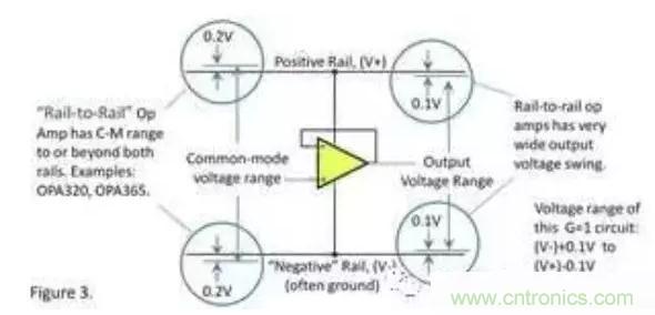 輸出電壓范圍“包含(幾乎達(dá)到)”供電電壓,即所謂軌至軌輸出。