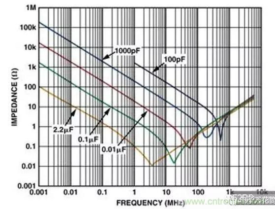 并聯(lián)不同電容值的電容器有助于確保電源引腳在很寬的頻帶上出現(xiàn)很低的交流(AC)阻抗。這對(duì)于在運(yùn)算放大器電源抑制比(PSR)衰減頻率處尤其重要。該電容器有助于補(bǔ)償放大器降低的PSR。在許多十倍頻程范圍內(nèi)保持低阻抗的接地通路將有助于確保有害的雜訊不能進(jìn)入運(yùn)算放大器。(圖一)顯示採(cǎi)用多個(gè)并聯(lián)電容器的優(yōu)點(diǎn)。在低頻段,大的電容器提供低阻抗的接地通路。但是一旦頻率達(dá)到了它們自身的諧振頻率,電容器的相容性就會(huì)減弱,并且逐漸呈現(xiàn)出電感性。這就是為什么採(cǎi)用多個(gè)電容器是很重要的原因:當(dāng)一個(gè)電容器的頻率回應(yīng)開(kāi)始下降時(shí),另一個(gè)電容器的頻率回應(yīng)開(kāi)始其作用,所以能在許多十倍頻程范圍內(nèi)保持很低的AC阻抗。