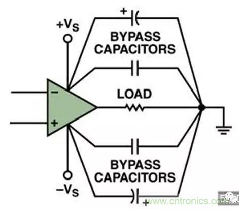 這種方法在大多數(shù)情況下都是最有效的,採(cǎi)用多個(gè)并聯(lián)電容器將運(yùn)算放大器的電源引腳直接接地。一般說(shuō)來(lái)兩個(gè)并聯(lián)電容就足夠了,但是增加并聯(lián)電容器可能給某些電路帶來(lái)益處。