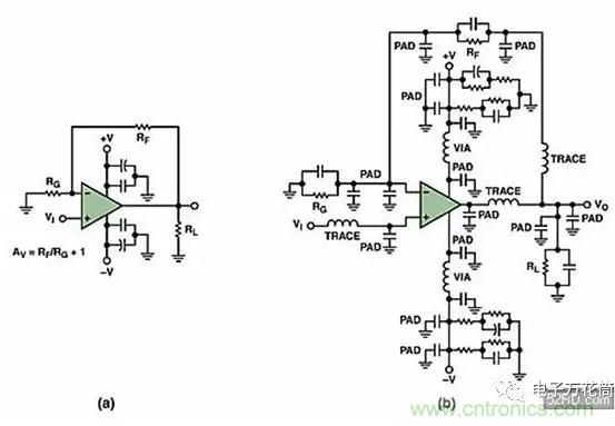 所謂寄生效應(yīng),按照字面意思就是那些出現(xiàn)在PCB板中并在電路中大施破壞、令人頭痛且原因不明的小故障。它們就是滲入高速電路中隱藏的寄生電容和寄生電感。其中包括由封裝引腳和印制線過(guò)長(zhǎng)所形成的寄生電感;焊盤(pán)(pad)到地、焊盤(pán)到電源平面和焊盤(pán)到印制線之間形成的寄生電容;通孔之間的相互影響,以及許多其他可能的寄生效應(yīng)。(圖三)(a)顯示一個(gè)典型的同相運(yùn)算放大器原理圖。但是,如果考慮寄生效應(yīng)的話,同樣的電路可能會(huì)變成圖三(b)那樣。