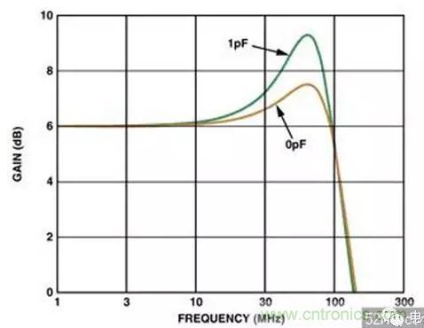 在高速電路中,很小的值就會(huì)影響電路的性能。有時(shí)候電容值幾十個(gè)pF的電容就足夠了。相關(guān)實(shí)例:如果在反相輸入端僅有1pF的附加寄生電容,它在頻率域可以引起差不多2dB的尖脈沖,如(圖四)。如果寄生電容足夠大的話,它會(huì)引起電路的不穩(wěn)定和震盪。
