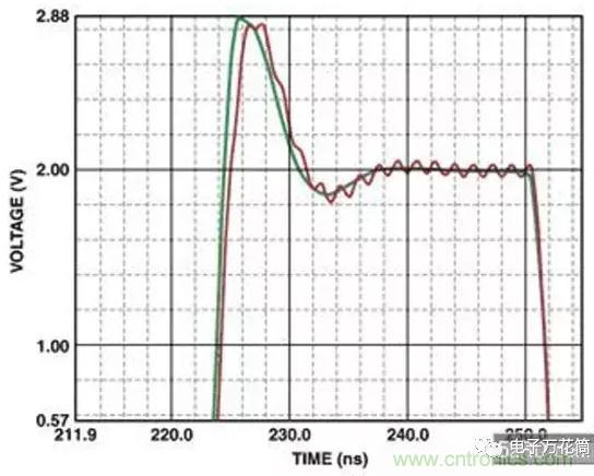 (圖七)中的震盪顯示高速運(yùn)算放大器同相輸入端長(zhǎng)度為2.54cm的印制線的影響。其等效寄生電感為29nH(10-9H),足以造成持續(xù)的低壓振蕩,會(huì)持續(xù)到整個(gè)瞬態(tài)回應(yīng)周期。圖七還顯示了如何利用接地平面來(lái)減小寄生電感的影響。