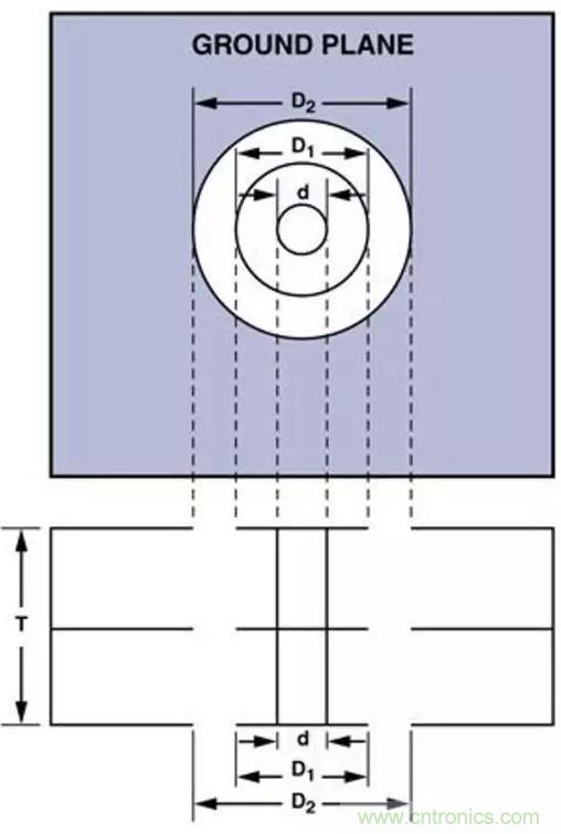εr表示PCB材料的相對(duì)磁導(dǎo)率。T表示PCB的厚度。D1表示環(huán)繞通孔的焊盤(pán)直徑。D2表示接地平面中隔離孔的直徑。所有尺寸均以cm為單位。在一塊0.157 cm厚的PCB上一個(gè)通孔就可以增加1.2nH的寄生電感和0.5pF的寄生電容;這就是為什么在給PCB佈線時(shí)一定要時(shí)刻保持警覺(jué)的原因,要將寄生效應(yīng)的影響降至最小。
