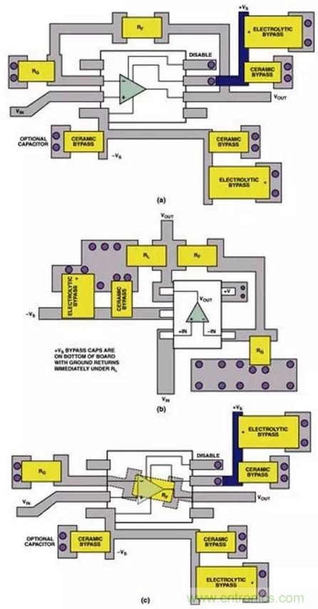 (圖九) 同一運(yùn)算放大器電路的佈線區(qū)別:(a)SOIC封裝;(b)SOT-23封裝;(c)在PCB下面採(cǎi)用RF的SOIC封裝