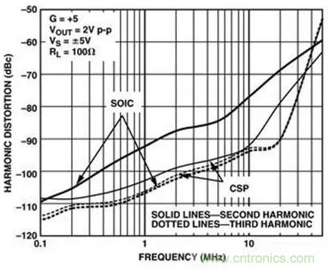這種引腳排列還有一個(gè)好處就是降低了二次諧波失真。傳統(tǒng)運(yùn)算放大器的引腳配置中引起二次諧波失真的一個(gè)原因是同相輸入和負(fù)電源引腳之間的耦合作用。LFCSP封裝的低失真引腳排列消除了這種耦合所以大大地降低了二次諧波失真;在有些情況下最多可降低14dB。(圖十二)顯示了採(cǎi)用SOIC封裝和LFCSP封裝失真性能的差別。