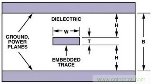 帶狀控制阻抗印制線(圖十四)採(cǎi)用了兩層接地平面,信號(hào)印制線夾在其中。這種方法使用了較多的印制線,需要的PCB層數(shù)更多,對(duì)電介質(zhì)厚度變化敏感,而且成本更高,所以通常只用于要求嚴(yán)格的應(yīng)用中。