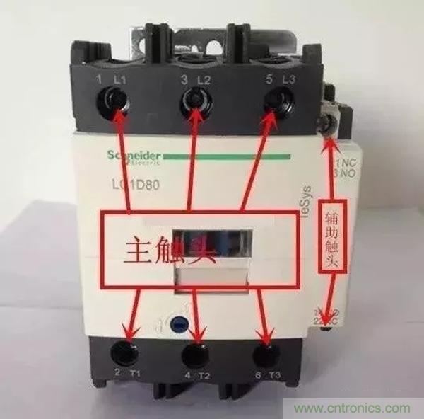 380伏交流接觸器有三個主觸頭,也就是電源進線和負載端出線,進線分別是三相火線L1、L2、L3,負載端出線分別是T1、T2、T3,接觸器主觸頭進線和出線上下一一對應(yīng),分別是L1對應(yīng)T1,L2對應(yīng)T2,L3對應(yīng)T3,主觸頭在接觸器不吸合的狀態(tài)下是常開狀態(tài)。