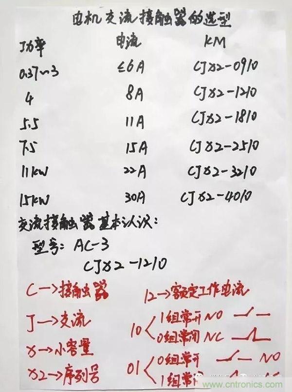 解釋:圖片上方為電動機的額定功率~工作電流~交流接觸器的型號規(guī)格,三者是一一對應(yīng)的!例如:15kw的電機,工作電流大概為30a,我們可以選用cjx2–4010的交流接觸器。