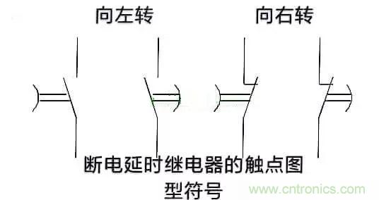 通電延時(shí)時(shí)間繼電器的觸點(diǎn)看圓弧,圓弧向圓心方向移動(dòng),帶動(dòng)觸點(diǎn)延時(shí)動(dòng)作。再看斷電延時(shí)時(shí)間繼電器的觸點(diǎn)的圖形符號(hào):