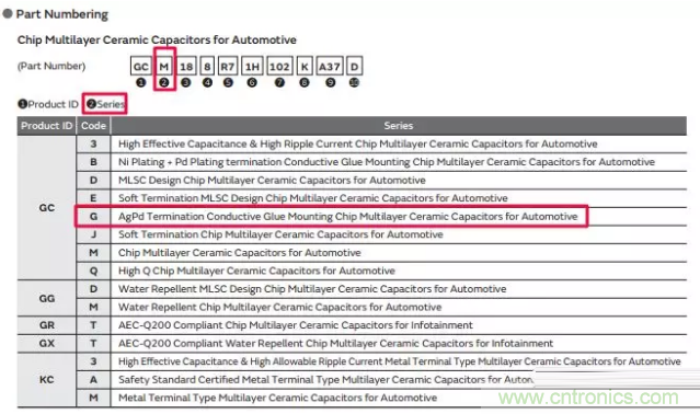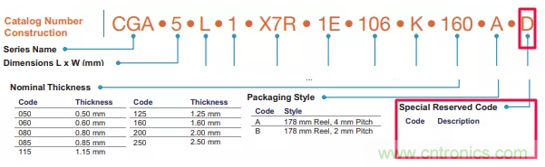 對于TDK的汽車級CGA系列的電容來說,環(huán)氧樹脂安裝的電容只在后綴上以一個(gè)字母"D"表示,這一般定義為“TDK內(nèi)部代碼”,并可以有其他字母如“A”、“B”、“C”、“E”等。