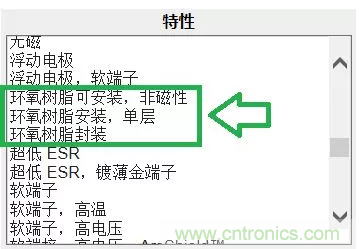 此外,有兩種選擇這些環(huán)氧樹脂安裝電容,或者過濾掉它們。若只選擇環(huán)氧樹脂安裝選項(xiàng),請?jiān)?quot;特性"選項(xiàng)中選擇環(huán)氧樹脂,如下圖所示: