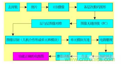 用大俗話來說,找一塊有用的芯片,照照相、制制版、提提圖、畫畫圖、仿仿真,芯片電路就反求了出來;編編工藝、設計工裝、將生產(chǎn)線開動,芯片又做了出來;再做做測試、進行老化,芯片就可以上市了。這就是集成電路反向開發(fā)的各道工序、完整流程。下面這張圖就說明了全過程。