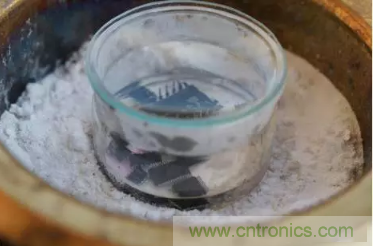 如果芯片外層那些焦炭不能機械地去除,那么就把它們投進濃硝酸液里面加熱到沸騰(溫度大約是 110 到 120 度)。
