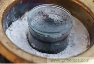 首先把要拆解的芯片放置在裝了濃硫酸的容器里,容器需要蓋住,但不能嚴實,這樣里面的氣體才能漫溢出來。把容器里的濃硫酸加熱到沸騰(大約 300 攝氏度),在瓶底的周圍鋪上蘇打粉——用來預防意外飛濺出來的硫酸液和冒出來的硫酸氣體。
