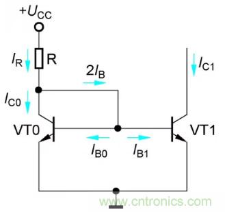 如圖1所示為鏡像恒流源電路,它由兩只特性完全相同的管子VT0和VT1構(gòu)成,由于VT0管的c、b極連接,因此UCE0=UBE0,即VT0處于放大狀態(tài),集電極電流IC0=β0*IB0。另外,管子VT0和VT1的b-e分別連接,所以它們的基極電流IB0=IB1=IB。設(shè)電流放大系數(shù)β0=β1=β,則兩管集電極電流IC0=IC1=IC=β*IB??梢?,由于電路的這種特殊接法,使兩管集電極IC1和IC0呈鏡像關(guān)系,故稱此電路為鏡像恒流源(IR為基準(zhǔn)電流,IC1為輸出電流)。
