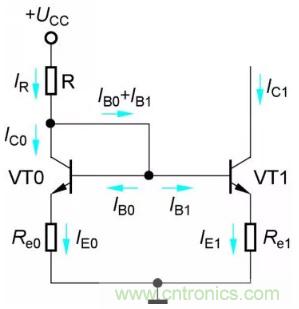 與典型的靜態(tài)工作點(diǎn)穩(wěn)定電路一樣,Re0和Re1是電流負(fù)反饋電阻,因此與鏡像恒流源電路相比,比例恒流源的輸出電流IC1具有更高的穩(wěn)定性。