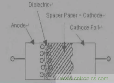 由于電解電容器存在極性,在使用時(shí)必須注意正負(fù)極的正確接法,否則不僅電容器發(fā)揮不了作用,而且漏電流很大,短時(shí)間內(nèi)電容器內(nèi)部就會(huì)發(fā)熱,破壞氧化膜,隨即損壞。 如圖為鋁電解電容的基本結(jié)構(gòu),它由陽(yáng)極( anode )、在絕緣介質(zhì)上附著的氧化鋁構(gòu)成的鋁層,接收極的陰極鋁層,和真正的由電解液構(gòu)成的陰極。電解液浸透在兩個(gè)鋁層間的紙上。 氧化鋁層是通過(guò)電鍍?cè)阡X層上,相對(duì)于加在其上的電壓來(lái)說(shuō)是非常薄的,很容易被擊穿,導(dǎo)致電容失效。