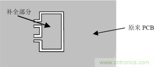 不規(guī)則形狀且沒拼板的PCB 應(yīng)加工藝邊。若PCB 上有開孔大于等于5mm×5mm的地方,在設(shè)計時要先將孔補(bǔ)全,以避免焊接時造成漫錫和板變形,補(bǔ)全部分和原有的PCB 部分要以單邊幾點連接,在波峰焊后將之去掉(見圖3.2)