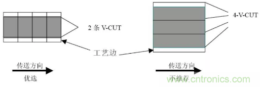 拼板方向應(yīng)平行傳送邊方向設(shè)計, 當(dāng)尺寸不能滿足上述拼版尺寸要求的例外。一般要求“V-CUT”或郵票孔線數(shù)量≤3(對于細(xì)長的單板可以例外),見圖3.4。