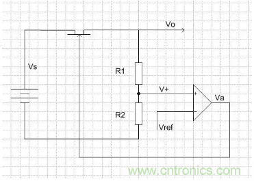 現(xiàn)在我們來(lái)看Vo是怎么穩(wěn)定的,假設(shè)Vo變小,那么V+將變小,放大器的輸出Va也將變小,這將導(dǎo)致MOSFET的阻抗變小,這樣經(jīng)過(guò)同樣的電流,MOSFET的壓差將變小,于是將Vo上抬來(lái)抑制Vo的變小。同理,Vo變大,V+變大,Va變大,MOSFET的阻抗變大,經(jīng)過(guò)同樣的電流,MOSFET的壓差變大,于是抑制Vo變大。