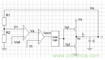 當(dāng)Vo上升時(shí),V+將上升,Va下降,Vpwm占空比下降,經(jīng)過(guò)們邏輯之后,Vg1的占空比下降,Vg2的占空比上升,Vp占空比下降,這又導(dǎo)致Vo降低,于是Vo的上升將被抑制。反之亦然。