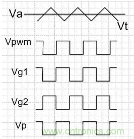 誤差放大器的正端Vref是一恒定的電壓,而PWM放大器的負(fù)端Vt是一個(gè)三角波信號(hào),一旦Va比三角波大時(shí),Vpwm為高;Va比三角波小時(shí),Vpwm為低,因此Va與三角波的關(guān)系,決定了方波信號(hào)Vpwm的占空比;Va高,占空比就低,Va低,占空比就高。經(jīng)過(guò)處理,Vg1與Vpwm同相,Vg2與Vpwm反相;最終L左端的方波電壓Vp與Vg1相同。如下圖