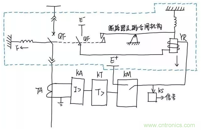 圖中的KA是一個(gè)電流繼電器,屬于測(cè)量比較元件。它通過(guò)測(cè)量回路接受來(lái)自電流互感器TA二次側(cè)的電流,并且和整定值進(jìn)行比較。如果輸入電流大于整定值,電流繼電器觸點(diǎn)閉合,這個(gè)觸點(diǎn)的閉合就是一個(gè)邏輯信號(hào)。這個(gè)邏輯信號(hào)會(huì)啟動(dòng)時(shí)間繼電器KT,這個(gè)時(shí)間繼電器屬于邏輯判斷元件。時(shí)間繼電器(邏輯判斷元件)接收到電流繼電器(測(cè)量比較元件)的邏輯信號(hào),經(jīng)過(guò)整定的時(shí)間延時(shí)(邏輯運(yùn)算)之后,如果輸入的邏輯信號(hào)不變,則將跳閘指令傳給執(zhí)行輸出部分,啟動(dòng)中間繼電器KM(執(zhí)行輸出元件),使KM接點(diǎn)閉合,通過(guò)控制回路使跳閘線圈YR帶電,斷路器跳開(kāi);同時(shí)通過(guò)信號(hào)回路使信號(hào)繼電器KS發(fā)出動(dòng)作信號(hào),提醒運(yùn)行人員保護(hù)動(dòng)作。
