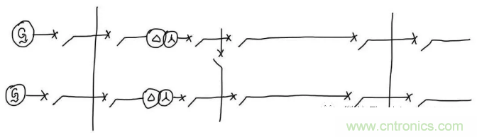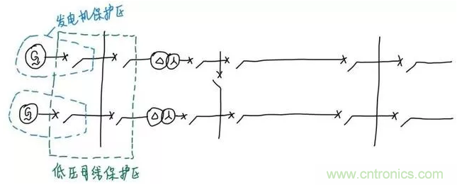 我們繼續(xù)往后看。可以看到發(fā)電機(jī)接到了低壓母線,對(duì)于這個(gè)低壓母線的保護(hù)來(lái)說(shuō),要做到故障時(shí)只停母線而不停其它設(shè)備,只要讓保護(hù)在故障時(shí)切除和母線直接連接的四個(gè)斷路器就可以了。所以四個(gè)斷路器旁邊的電流互感器圍成的范圍就是這條母線保護(hù)的保護(hù)范圍。